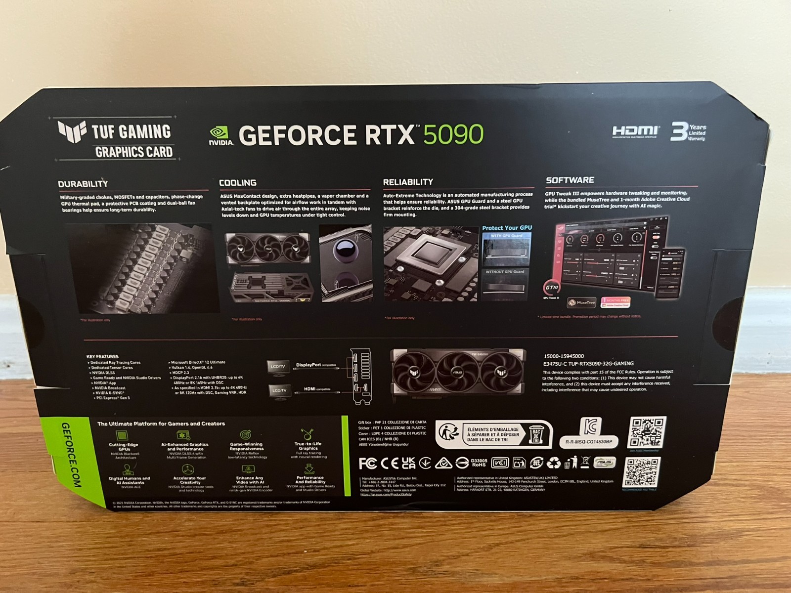 The ASUS TUF Gaming NVIDIA GeForce RTX 5090 32GB GDDR7 PCI-E 5.0 Graphics Card boasts impressive specifications and features for gaming enthusiasts. With a chipset manufactured by NVIDIA and support for APIs like DirectX 12 Ultimate and OpenGL 4.6, this card delivers high-quality graphics performance. It comes with 32GB of GDDR7 memory, a cooling component with a fan and heatsink, and RGB lighting for a customizable look. Additionally, it is G-SYNC/FreeSync compatible and VR ready, making it ideal for gamers looking for smooth and immersive experiences. This graphics card is backed by a 3-year manufacturer warranty and is compatible with PCI Express 5.0 and 4.0 slots.